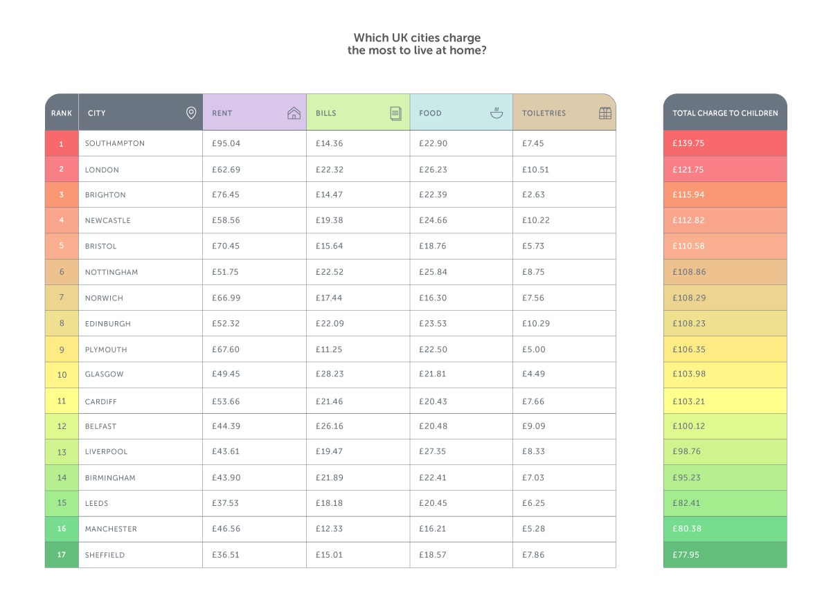 Our research also suggests parents in the UK have many different views when it comes to the ‘right amount’ to charge for rent, bills, food and toiletries. There is a clear north-south divide, as parents in Southampton are charging the most at £139.75 per month, whilst parent-landlords in Sheffield are charging the least, asking for a mere £77.95 per month.