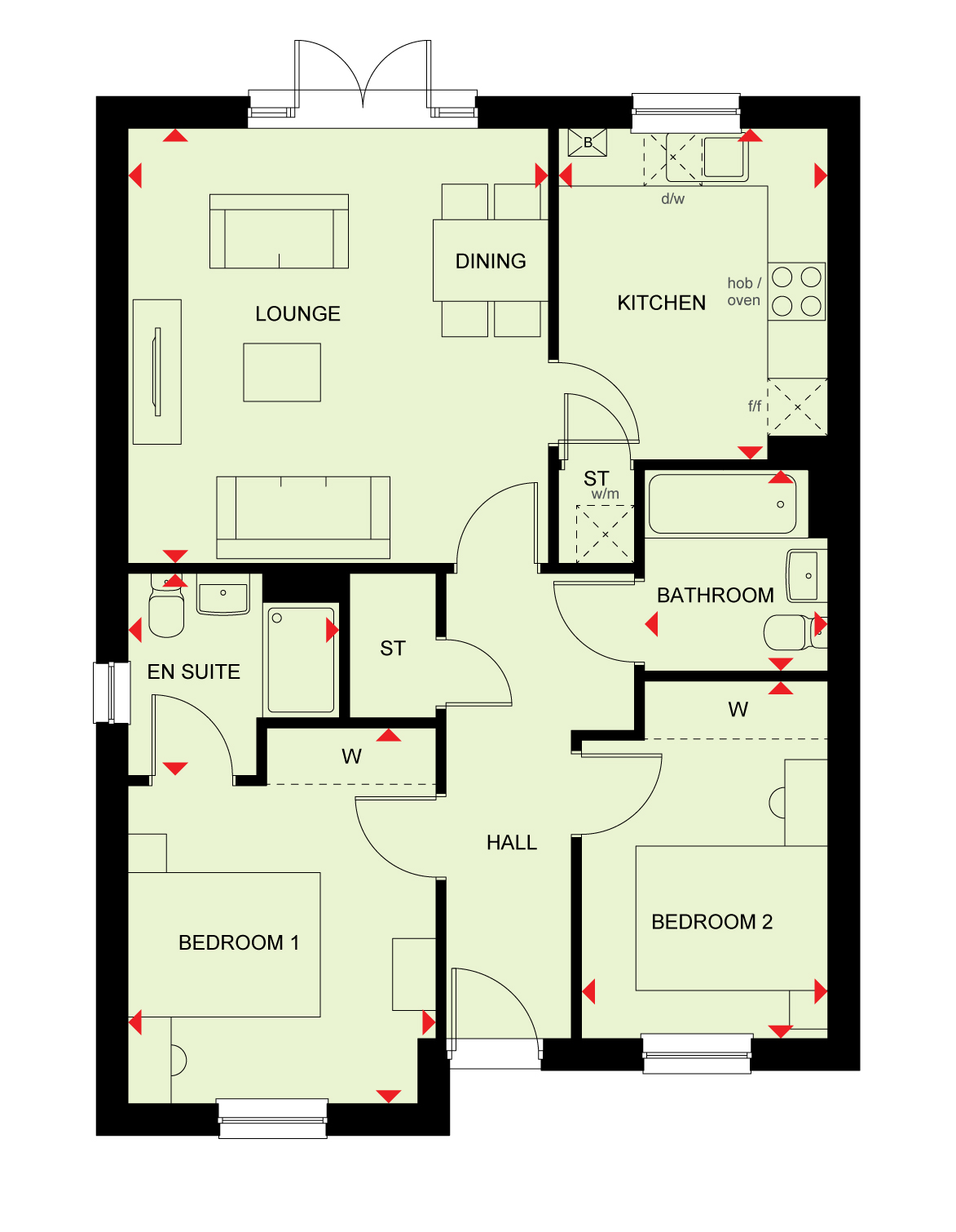 This 2 bedroom home features living all on one level, The back of the home features an open plan lounge/dining area with French doors leading out to your garden. A separate kitchen completes this living space. 2 generous bedrooms are located to the front of the home, the main containing an en suite.