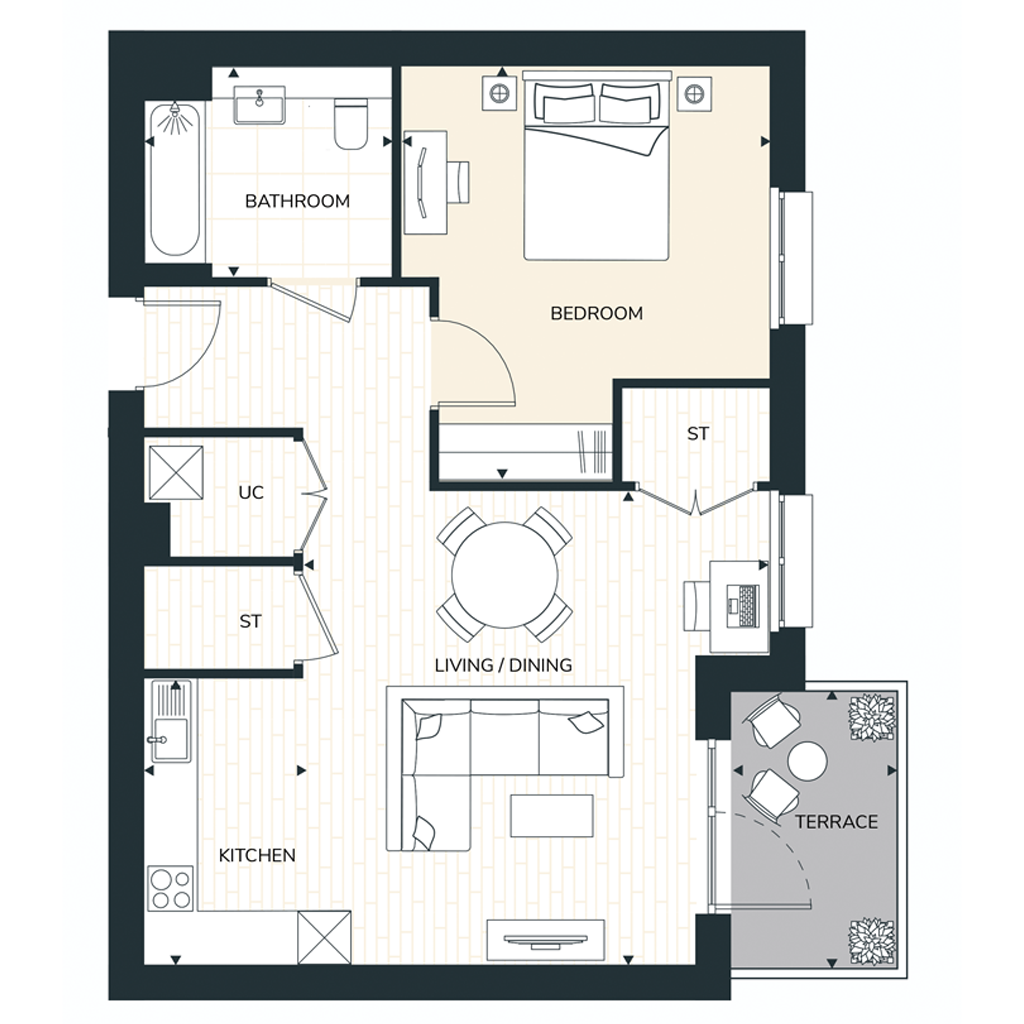 The Lanes offers a modern, ground floor one-bedroom apartment that features a spacious private terrace, leading into an open-plan living/dining area and stylish kitchen fitted with AEG appliances.
